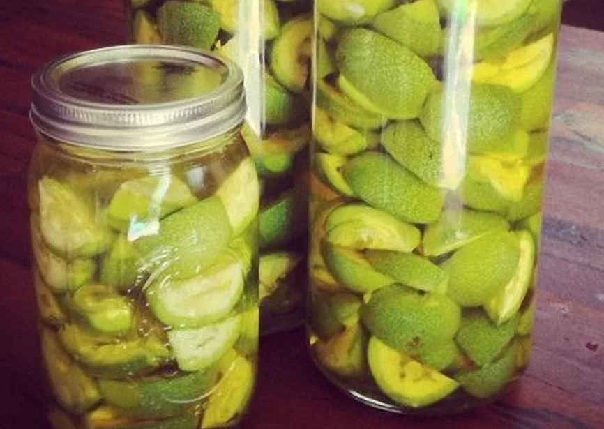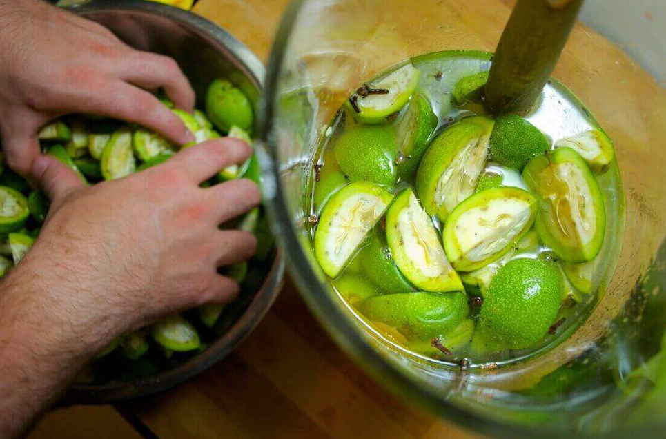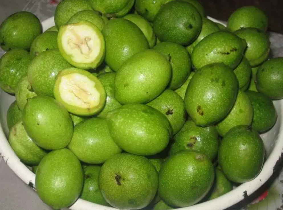 Rupeți nucile verzi într-o perioadă în care diametrul lor este de 1,5-2,0 cm, se taie fin și se umple cu zahăr.