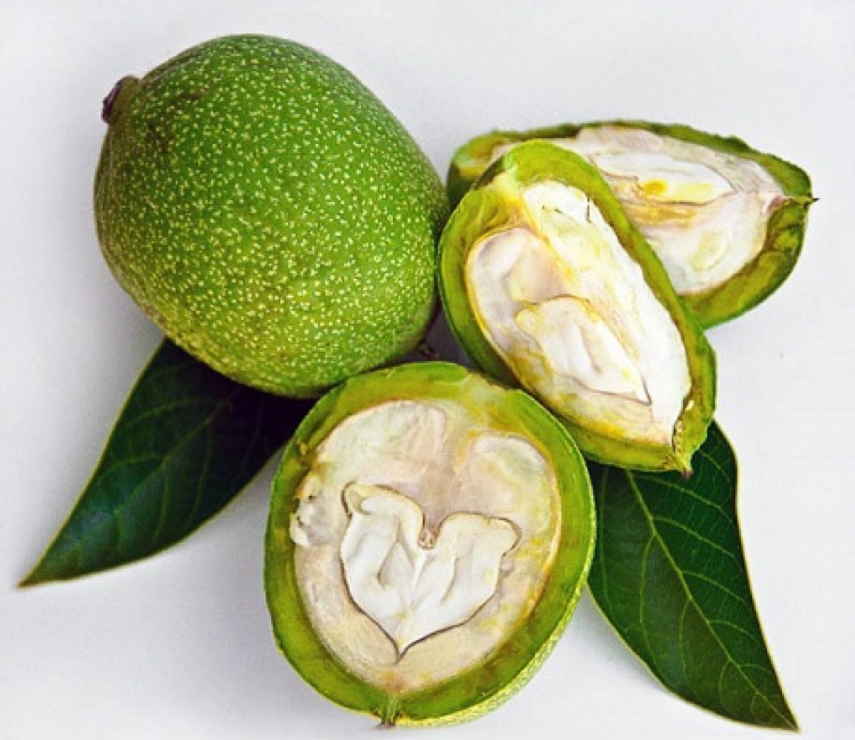 Nucile verzi colectate la sfârșitul lunii mai conțin cantitatea maximă de vitamina C, E, P, 1 și B2, caroten, chinonă.